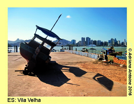 In 2011, I was invited for a guest lecture at a private university in the state of Espírito Santo. It was in the city of Cachoeiro de Itapemirim, in the state countryside. After this lecture, which I had to give in Portuguese about my PhD thesis, I continued my travel to Guarapari, where I stayed for some days. From there, I visited Vila Velha and neighboring Vitória. The Baia (bay) de Vitória splits Vila Velha from the Ilha (island) de Vitória. On the picture is the skyline of Vitória visible, on the horizon. In front is a fishing boat on land, probably for maintenance. It was a very sunny day, there was only one tiny white cloud in the blue sky.