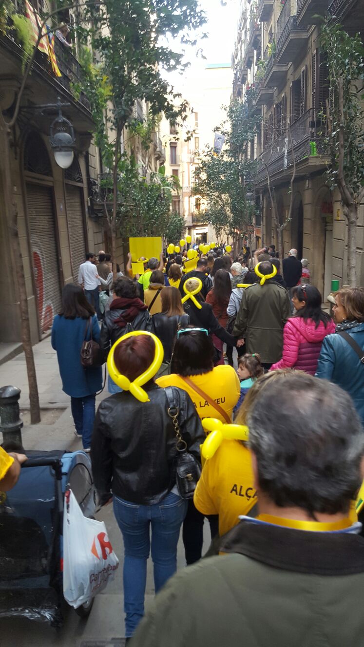 A modest but noisy group, donning yellow t-shirts and scarves, balloons and signs. We gathered in the the square of the gothic Cathedral of Barcelona pre-march and before we set off, a lady and…