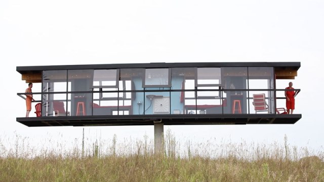 Artists Alex Schweder and Ward Shelley latest work entitled ReActor is a house that rotates 360 degrees on a concrete column and also tilts in response to the artists movements, exterior forces, and interior conditions. Commissioned by OMI International Arts Center, the house located in upstate New York is a 44-foot by 8-foot structure that has identical living quarters, a shared bathroom in the center, and two external balconies—one for each artist. ReActor adds to the artists’ series of experimental “performance architecture” based on the notion that relationships between occupied spaces and occupying subjects are permeable.