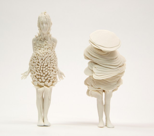 Since 2013, artist Claudia Fontes (previously) has been investigating the use and meaning of the word “foreigner” in a series of small figurative sculptures. Each sculpture, which is about the size of Fontes’ hand (about 23 x 5 cm / 9 x 2 inches) is made with flaxseed paper porcelain. Anonymous figures, alone or in groups, are consumed by or emerging from organic textures that resemble grass, sea sponges, and thin shards of stone. Fontes has been based in England for the last ten years, where ‘foreigner’ is a popular pejorative term. She was born and raised in Argentina, and has also lived and worked in the Netherlands.
