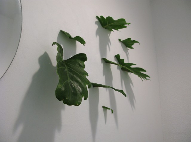 Philodendron Xanad is a repeating site-specific installation by Belgium-based artist Ruben Bellinkx that physically imbeds a common houseplant into the walls of galleries and homes. The plant calmly rests on one side of the wall as several of its leaves reach through layers of dry wall and wooden beams to grow on the other side.