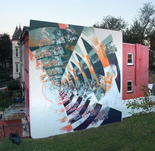 Robert Proch combines the aesthetics of street art and fine art in his dizzyingly complex paintings and murals. The artist engages multiple perspectives, glitched repetitions of figures, architectural motifs, and tightly controlled color palettes to create his distinctive style. Scenes tend to radiate out from a central perspective point, surrounded by abstracted shapes and atmospheric brushstrokes.