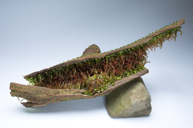 French artist Julie Gonce‘s artworks imitate the beauty and detail of natural forms—budding flowers, moss growing within fallen branches, and dew delicately balanced on strands of fresh grass. Gonce has been creating her glossy sculptures since 1997, and uses her torch similarly to show how a conductor uses a baton—with precision, passion, and timely delicacy. Her sculpted forms ask the viewer to be attentive to our changing planet, and to notice how beautiful and bountiful nature is as it continually replicates.
