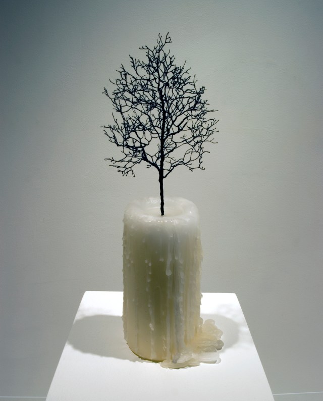 MyeongBeom Kim (previously) builds unique works by combining everyday objects whose purposes are often in stark contrast. The sculptures are created from recognizable pieces such as birthday cake candles, canes, and standard #2 pencils. These objects are reworked to drastically limit their inherent purpose, like the untitled sculpture below in which the Korean artist floats a helium-filled balloon inside of a bird cage. The latex bubble is unable to rise higher than the surrounding metal enclosure, and thus balances within the structure until its eventual deflation.