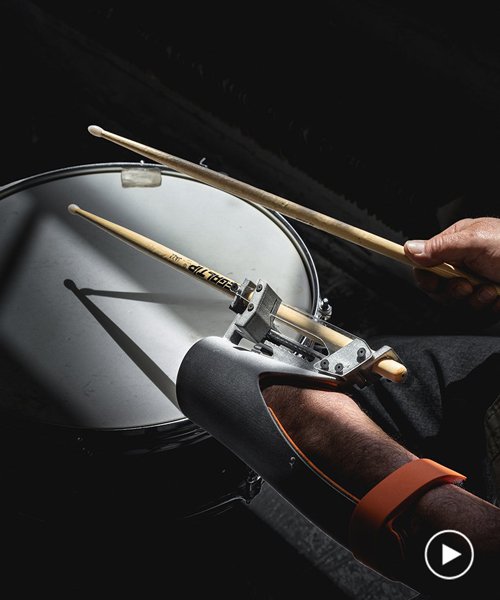 ‘paradiddle’, an essential rudiment of drum beats, is an open-source 3D-printed upper-extremity prosthesis designed specifically for amputee drummer by young china-born and USA-based designer dominic siguang ma. to develop unique features that would allow the drummer to play more intuitively and comfortably, the designer worked with renowned amputee drummer greg anton.