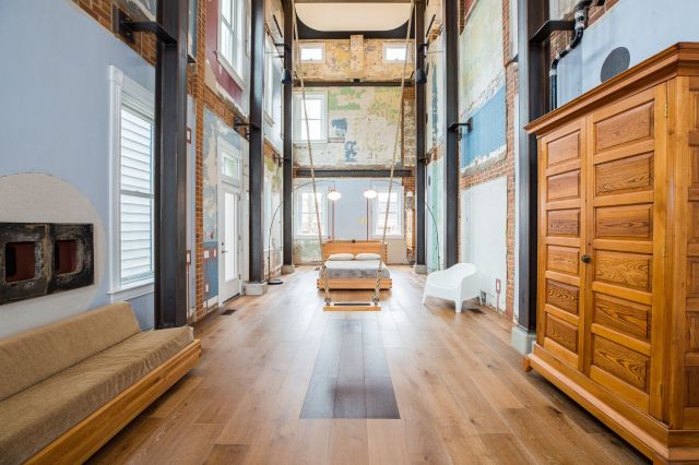 From the outside, artist Mark deJong’s contemporary installation, Swing House, doesn’t particularly stand out from the other residences lining the street of Cincinnati’s Camp Washington neighborhood. The blue 19th-century building is narrowly built, and features charming architectural details that cap its windows and roof. The interior however, is remarkably different. All three levels of the home have been completely gutted to create an open floor plan void of any interior walls or floors, with a single swing positioned at the center of the space.