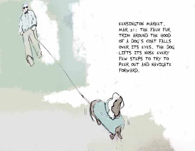 It was a cold day in March when I came across this little dog trying to cope with its wardrobe malfunction. And then a few days later: