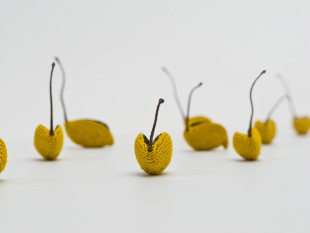 “The meticulous act of crocheting mimics the instinct to nurture and protect what is viable, what is becoming precious,” she explains in an artist statement. “As in gilding, these false ‘skins’ imbue the objects with an assumed desirability or value; the wrapping becomes an act of veneration. Although futile in its attempt at archiving and preservation, it suggests optimism.”[…]