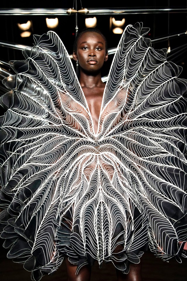 “As a former dancer, the transformation within movement has hypnotized me,” explained van Herpen in a statement about Syntopia. “For this collection I looked closely at the minutiae of bird flight and the intricate echoing forms within avian motion.”