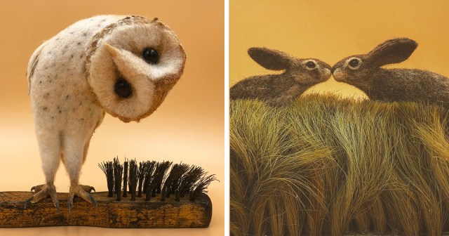 Simon Brown sources worn-out household tools like brushes and thimbles and turns them into miniature scenes for his felted wildlife. A short, stiff brush becomes a tree branch for a perching owl, and a dense hair brush with swirling bristles forms a meadow for two rabbits. Brown, who is based in Northumbria, United Kingdom, uses needle felting to create his realistic forest creatures.