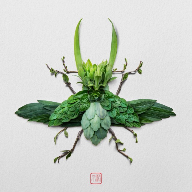 Raku Inoue (previously)recently look an extended road trip to several destinations in the American Southwest. During his journey he created a scorpion-shaped arrangement from seeds, sticks, and a pepper found at Antelope Canyon in Arizona, and utilized a fallen cactus segment near Horseshoe Bend as the abdomen in a prickly tarantula. Other works created with found natural elements during Inoue’s trip include a turtle bug, red ant, and centipede.