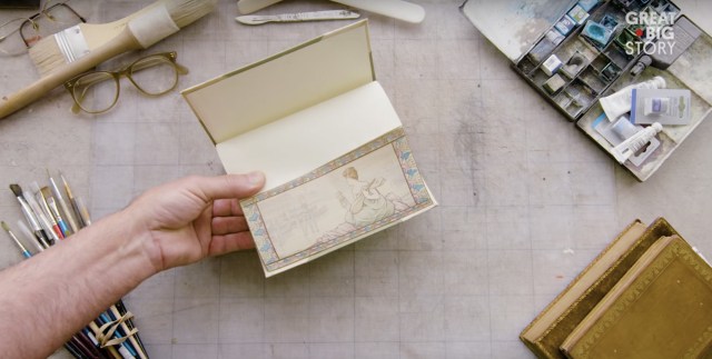 Martin Frost creates paintings in places that people can’t see, or can only find if they know exactly where to look. The UK-based artist is a fore-edge painter, which means he produces elaborate designs and scenes along the edges of gilded books. The works are discovered only when you fan the pages in a certain way, and become hidden by the book’s gold edges as soon it is closed. “It is a discrete painting,” Frost tells Great Big Story. “It is only there when you know how to unlock it.”