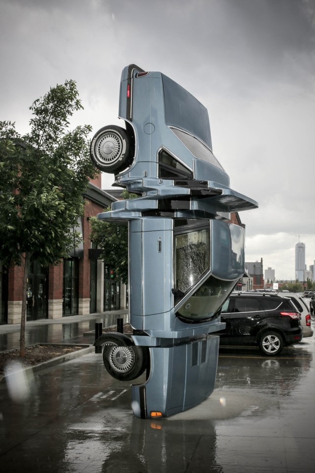 Caitlind r.c. Brown and Wayne Garrett (previously) create large, public installations that invite people to engage in a shared experience. Their latest work cruised into Edmonton’s Brewery District late last month—a blue 1988 Plymouth Caravelle balanced perfectly on its front bumper and headlights. At first glance the car appears to have stuck a perfect vertical landing after a tragically wrong maneuver, but upon closer inspection one notices glitched segments that protrude from the vehicle’s body and front wheel.