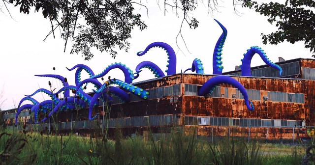 Twenty inflatable tentacles extend from the roof and several windows of a two-story warehouse in Philadelphia’s Navy Yard, making it appear as if sea monsters have attacked the former naval storehouse in an installation titled Sea Monsters HERE. The massive work is the largest inflatable sculpture ever created by UK-based artists Filthy Luker (previously) and Pedro Estrellas. It was produced in partnership with Group X, an anonymous collective of local artists and curators, and the Navy Yard which extends along the Delaware River.