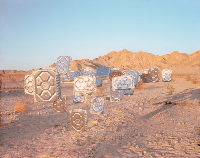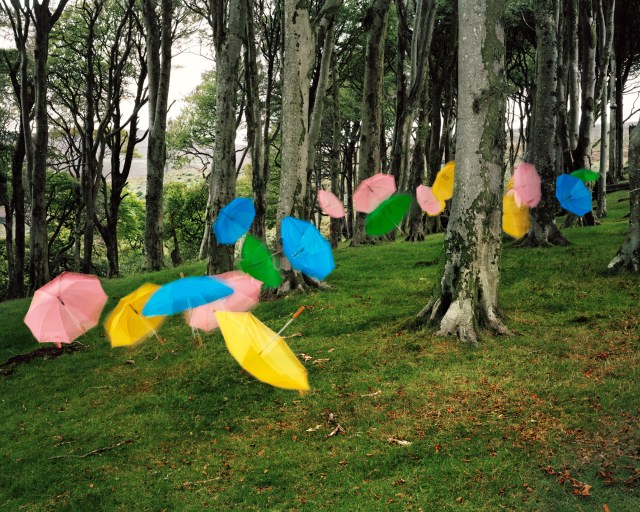 Thomas Jackson (previously) uses man-made objects to imitate the self-organizing behavior of large groups of birds, fish, or insects in his ongoing series “Emergent Behavior.” For this project, the San Fransisco-based artist clusters brightly colored umbrellas, plates, or streamers together with the help of imperceptible filament, which makes the objects appear as if they are floating through the landscape on their own.