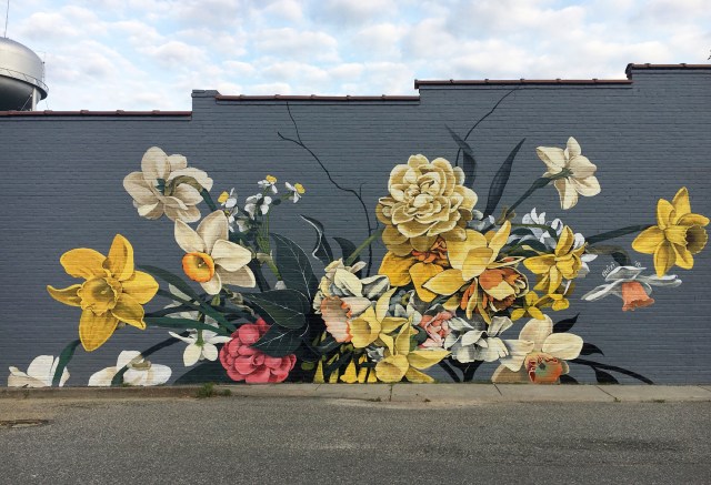 Artist Louise Jones (previously), known professionally as Ouizi, focuses on flowers in her multi-faceted practice. Whether creating towering outdoor murals, carving linoleum prints, completing indoor mural commissions, or painting on more traditional canvases, Jones creates groupings of real and imagined blossoms. In addition to painting in her home base of Detroit, where she has completed over 40 murals, Jones travels widely to execute work, including in Los Angeles (her hometown), Shanghai, New Zealand, and New York.