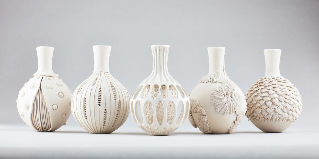 U.K.-based ceramic artist Anna Whitehouse set a goal on January 1, 2018 to create a new bottle each day for 100 days. By limiting herself to a single form, Whitehouse was able to stretch her creativity to formulate new designs previously unexplored in her practice. Each white ceramic bottle was uniformly shaped, but the designs she created on the surface differed each day. Some bottles were punctured with tiny repetitive holes, while others were covered in leaf-like applications or floral motifs.