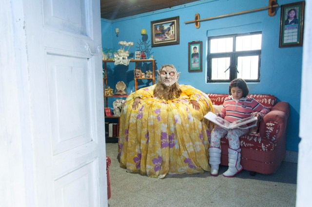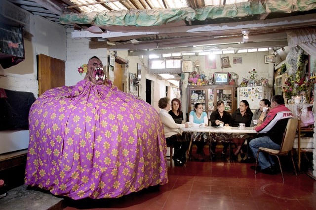 Photographer Diego Moreno incorporates ancestral imagery with a familiar contemporary universe in his series “In My Mind There is Never Silence.” The artist shares with Colossal that the characters that populate the series draw from his personal family history along with pre-Hispanic Mexican traditions. Each photograph depicts a normal domestic scene: gathering around a table for coffee, getting a hair cut, or playing in the living room with television on in the background. Moreno’s grotesque guardians are participants in or witnesses to these everyday tableaux, which doesn’t seem to surprise or alarm the humans in the room.