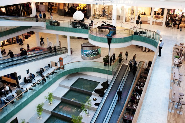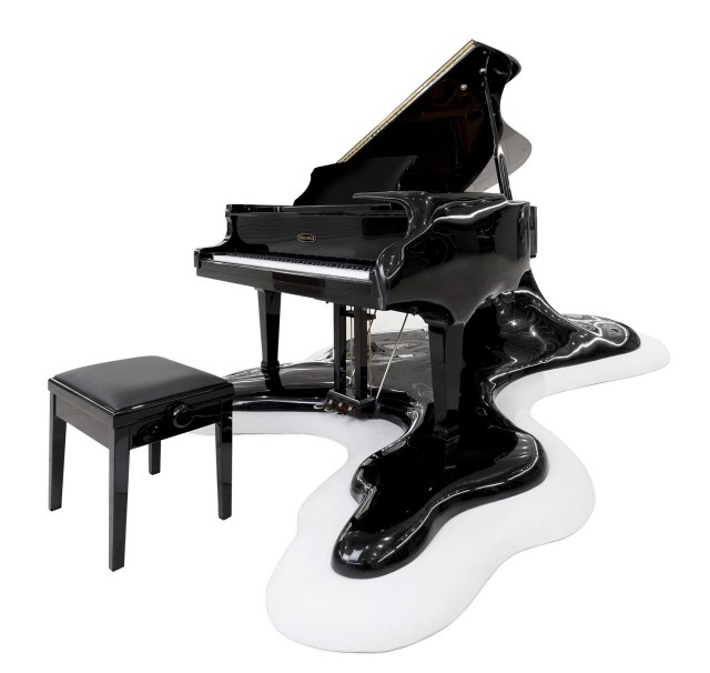 Danish artistNina Saunders creates sculptures that drip, tip, and spill what appears to be amorphous contents onto the ground, turning domestic objects of comfort and kitsch into sculptural pieces unintended for practical use. Her works typically involve secondhand furniture like armchairs and love seats, with the occasional melting piano thrown into her multi-media practice. Floral fabrics run from chair to floor, while the shiny black exterior of a piano seems to leak from its position on the balcony of a busy mall.