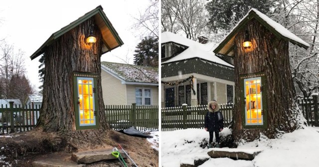 One family in Idaho took their Library design to the next level with a “Little Tree Library,” carved out of a 100-year-old cottonwood tree stump on their property. Sharalee Armitage Howard, you’ll not be surprised to learn, works as a librarian and previously studied bookbinding, according to her Facebook profile. She spearheaded the complex installation on her front lawn, including dentils that, upon closer inspection, are actually miniature books complete with titles. The Library also features interior and exterior lighting, to give the space an extra-homey glow, as well as a “roof” over the top of the stump to help prevent its weathering away.