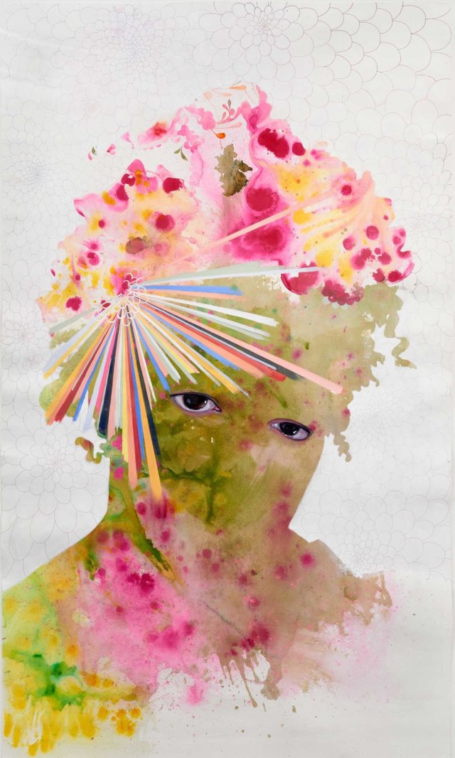 Using acrylic, gouache, ink, and graphite, artist Firelei Báez creates intricate portraits that blur the boundaries between abstraction, realism, and surrealism. Báez forms human figures with skin comprised of swirling bursts of color and pattern, while meticulously rendered strands of hair and piercing eyes anchor the vibrant abstracted shapes as people. In a statement on her website, the artist’s practice is described as “a convergence of interest in anthropology, science fiction, black female subjectivity and women’s work; her art explores the humor and fantasy involved in self-making within diasporic societies.”