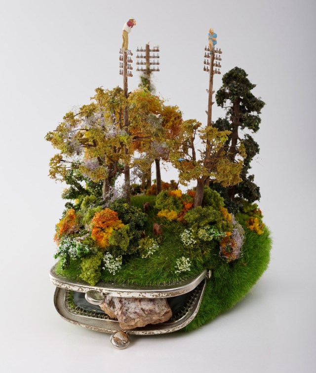 Kendal Murray works in miniature, crafting assemblages that present familial scenes built into and on top of common items found in the home such as glass tea pots or coin purses.