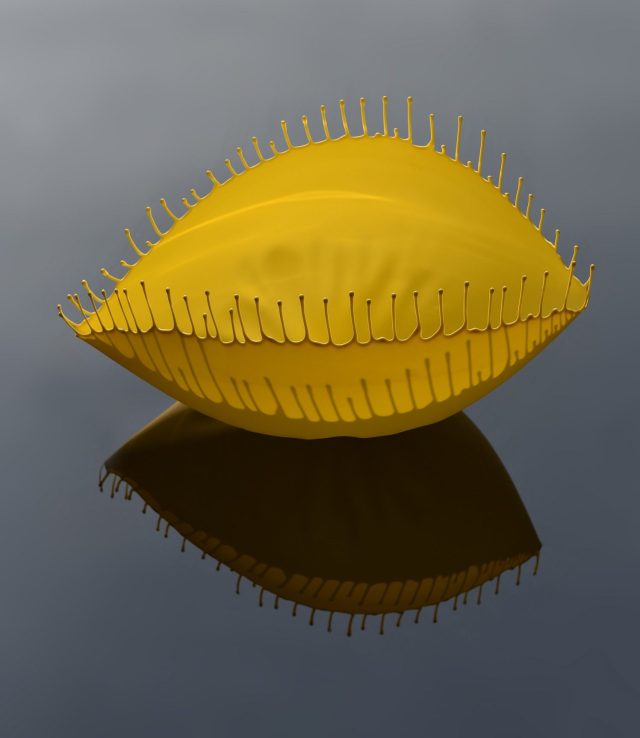After adding the clay to silicone moulds, Bian turns the pieces upside down and lets the natural flow of the clay create a unique shape. In the high-temperature firing process, this ultra-thin clay body further morphs into different forms. Once his ceramics are formed, the artist paints them, using an array of colorful pigments including metallic grey and sunflower yellow.