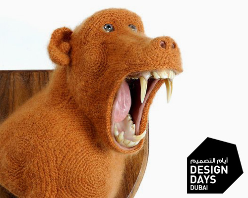 designboom is attending design days dubai 2015, the leading fair in the middle east and south asia dedicated to collectible and limited edition furniture and design objects, specially curated installations, live performances and workshops. among this year’s exhibitors is crafts council, which presents a piece from the handmade sculptural series of artist shauna richardson. the UK-based creator has developed a technique using crochet to sculpt realistic life-size animals she has coined ‘crochetdermy’. using materials like coarse wools, mohair mixes, glass eyes, and reproduction claws, richardson painstakingly renders the anatomical features of baboons, lionesses, hares and bears. autonomously working over a period of months, the artist clearly links the craft of taxidermy with crochet, marrying two creative methodologies and modes of preservation.