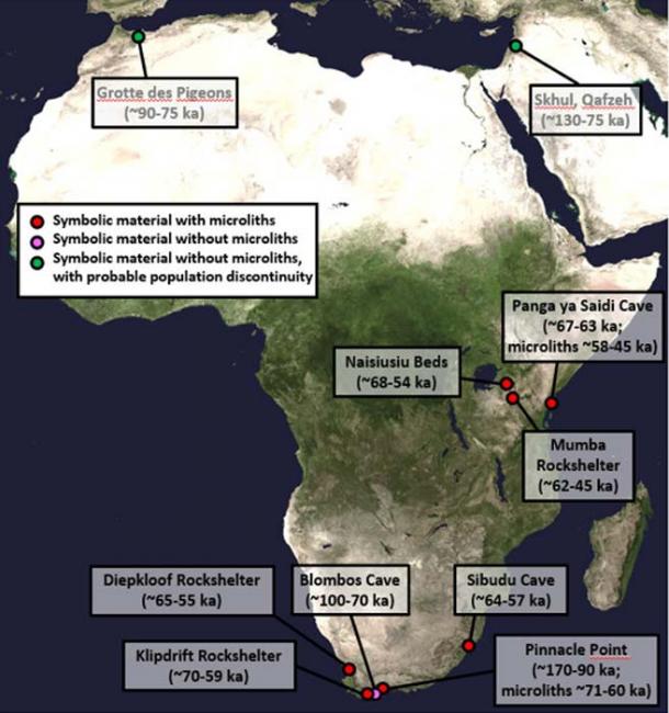 Between around 100,000 and 70,000 years ago, these people left plentiful evidence that they were thinking and behaving like modern humans – evidence for symbolism, such as the use of pigments (probably for body painting), drawings and engravings, shell beads, and tiny stone tools called microliths that might have been part of bows and arrows. Some of this evidence for what some archaeologists call “modern human behavior” goes back even further, to more than 150,000 years.