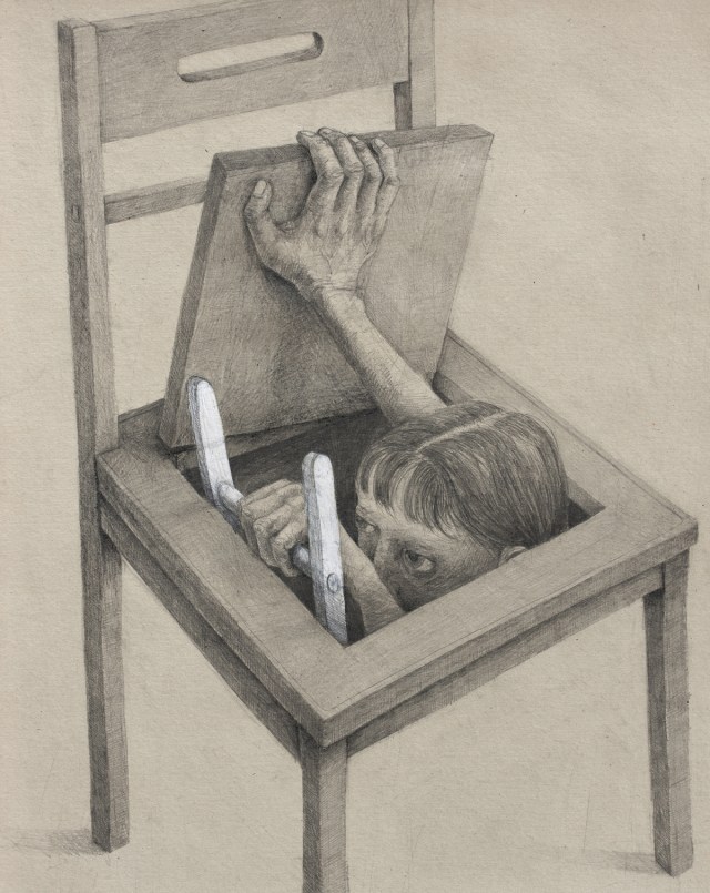 Solitary protagonists investigate, embrace, or hide from emotions in evocative new drawings by Stefan Zsaitsits. The Austrian artist (previously) depicts individuals in situations that balance relatable everyday moments with surreal twists. Sitting at a dining table, one subject snorkels into the tablecloth, while another inexplicably emerges on a ladder from the seat of a chair[…]