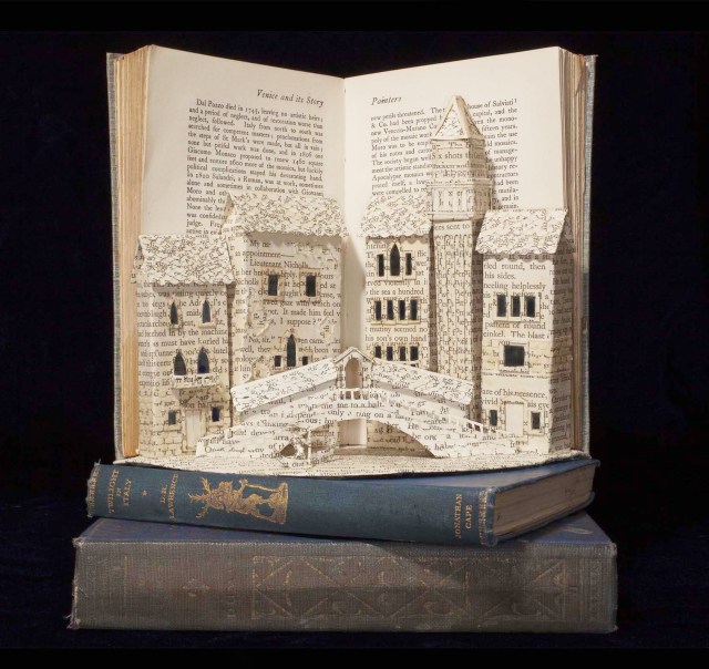 UK-based book sculptor Emma Taylor sources old books from charity and antique shops and gives them a second story. Taylor uses simple materials—just glue, paper, and scissors—to sculpt architectural facades, lively animals, and leafy trees from otherwise unused titles. Each scene is inspired by the book’s written content, with a garden scene emerging from An Introduction to Botany and Italian houses built out of The Story of Venice.[…]