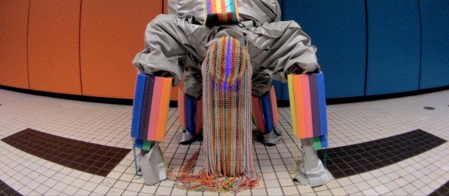 The actors in FILTRATE sport futuristic costumes made by Odette Mattha with shimmering tinsel, long strands of party beads, and textured fabrics that match the setting’s architectural details. Mattha’s designs take advantage of the unique feel of different areas of the Metro system: each station was created by a different architect. Though the filmmakers clearly used the spaces during off-peak times, we can only wonder at the surprise of an unsuspecting commuter.