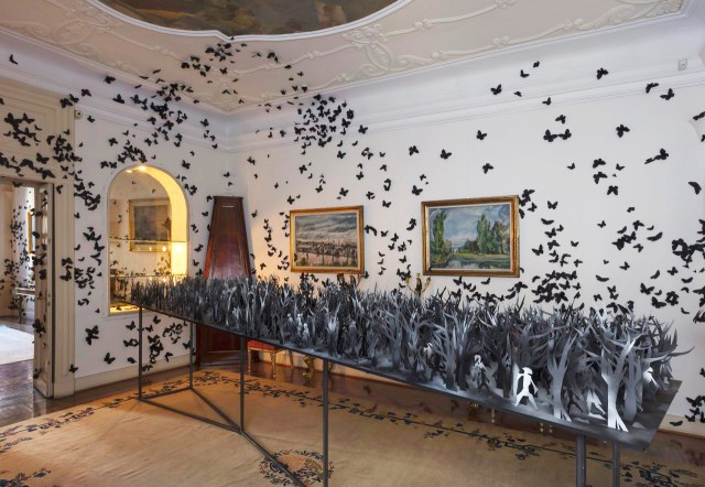 Hordes of black butterflies of various sizes and species cover the grand staircase, mirrors, walls, and doors of the Milan-based Fondazione Adolfo Pini. The dark and vast swarm is a part of the more than 10-year series Black Cloud by Mexican artist Carlos Amorales (previously) as a part of his solo exhibition THE ACCURSED HOUR. The butterflies surround an installation of paper cut-outs from his series Life in the folds, a project of gray-toned human and tree silhouettes which address the nature of human violence against other humans. [..]