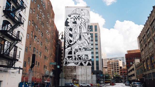 In 2014, when the City of Detroit threatened to sell many of the Detroit Institute of Art’s prized artworks to help the Motor City exit bankruptcy, the question of art’s role in the city’s future came front and center. Ultimately, the museum raised nearly a billion dollars to preserve the city’s cultural heritage—and its Picassos. Two years before, in what has become known as a “grand bargain,” local residents, husband and wife duo Anthony and JJ Curis, decided to open the Library Street Collective on a once-barren stretch of land. The Collective is a gallery with a traditional artist roster and a mission to revitalize the city by commissioning artists from the city and around the world to make public art in the streets of Detroit.