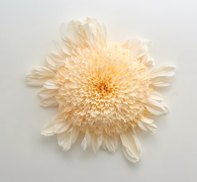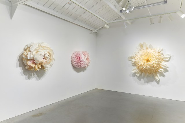 In her latest solo exhibition, What Befell Us, California-based artist Tiffanie Turner explores notions of aging, imperfection, and perishability. Massive flower blossoms including dahlias, garden roses, ranunculus, and strawflowers are formed from Italian crepe paper and span more than five feet across. While in her previous work Turner strove for the ideal phenotype of each flower, in What Befell Us the artist pushes past perfection to investigate our collective relationship to flaws and damage.