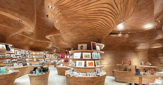 Patches of natural and artificial light highlight the curved layers of the National Museum of Qatar’s recently completed gift shop. The massive undulating walls were constructed from over 40,000 pieces of timber that tower high above visitors’ heads and imitate the shape and feeling of the Dahl Al Misfir or Cave of Light. The Qatar landmark is an underground formation that contains a wealth of gypsum deposits, which illuminate the cave with a phosphorescent glow and often form clusters of rose-shaped crystals known as “desert roses.”[…]