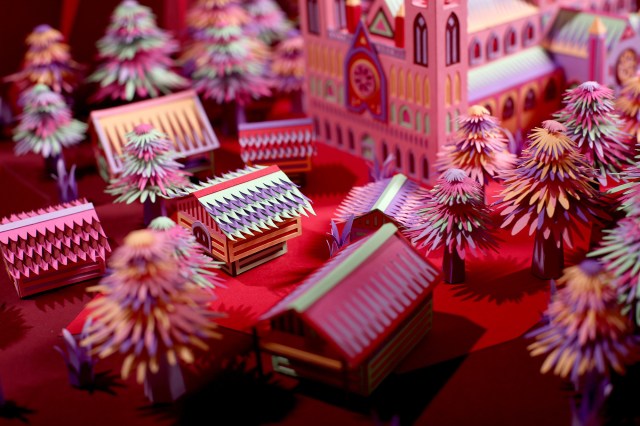 Paper artists and collaborators Zim & Zou (previously) were invited to create miniature worlds inspired by previous Nobel Prize winners in Literature. The tolerance-themed traveling exhibition Sharing Worlds was organized by the Mohammed Bin Rashid Al Maktoum Knowledge Foundation. The French duo built pieces based on Kristin Lavransdatter written by Sigrid Undset (published in 1920), and One Hundred Years of Solitude written by Gabriel Garcia Marquez (published in 1967). Using their own classic style, the pair created colorful scenes packed with geometric details. Their interpretation of Kristin Lavransdatter was created as an ode to 14th-century Norway with a technicolor city set between a pair of deep burgundy mountains. The other work, One Hundred Years of Solitude, features a verdant home nearly hidden from the world by a lush pink and green garden.[…]
