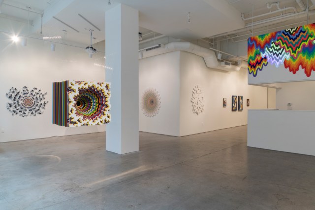 Los Angeles-based artist Jen Stark (previously) uses materials such as paper, wood, and metal to create optically-charged sculptures based on complex scientific and mathematic concepts. Layered colors with both smooth and warped edges create tunnels into the unknown, forming visual interpretations of ideas such as infinity, evolution, or sacred geometry.[…]