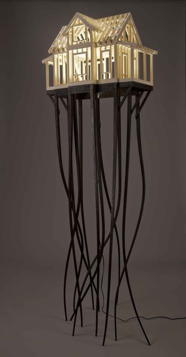 To build his works, Lott uses a bandsaw as a scaled sawmill to generate miniature pieces of wood and other proportioned raw materials. Found and vintage furniture provide the base of his structures which are then lit from within as if someone is home.