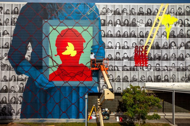 Muralists from around the world including JR, Faith XLVII, Axel Void, and Daniel Arsham came together for a weeklong Maya Angelou Mural Festival in Los Angeles celebrating the legendary poet. The artists, numbering more than two dozen, decorated the Dr. Maya Angelou Community High School with wall-scaling paintings that depicted or celebrated the visage and message of Dr. Angelou.[…]