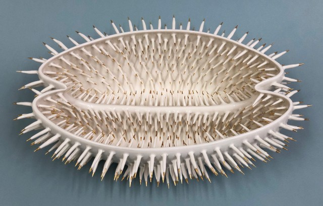 London-based artist Ikuko Iwamoto gathers inspiration for her spike-covered vessels from microscopic sources, imitating the shape of the nearly invisible microorganisms that inhabit our bodies. To create the objects, Iwamoto first slip casts the body of the bowl. Next she drills dozens of holes into the surface of the vessel and fills them with double-ended clay spikes secured with slip. Their extreme texture comes from her interest in providing a physical investigation to her audience in addition to their visual presentation.[…]