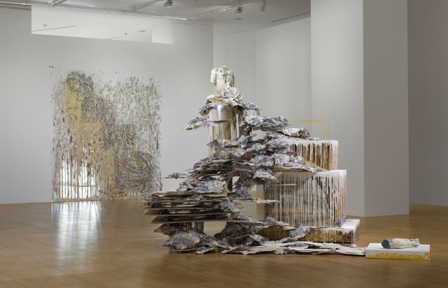 Diana Al-Hadid creates large-scale sculptures and installations that merge bodily forms with collapsing altars, columns, and other architectural forms. Headless bronze figures in repose appear to drip down concrete blocks, while organs surround fictional players like beautiful beasts. In each, the Syran-American artist references archaeological remains, […]