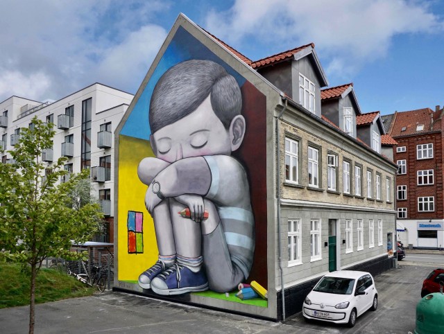 Titled 1,2,3, Soleil, the exhibition features over 50 of the artist’s faceless characters. Each room in the chateau has a theme that represents one of Malland’s previous projects in countries around the world. Vibrant colors and geometrical shapes are complicated by themes of conflict and loneliness. The exhibition includes site-specific installations as well as collaborative pieces made with artists Mono Gonzalez and Pascal Vilcollet.[…]