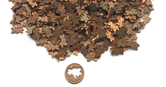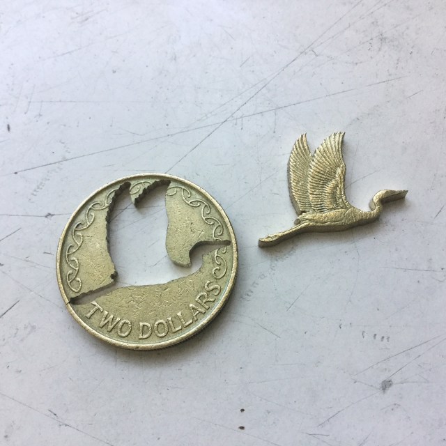 From a growing pile of copper leaves taken from Canadian pennies, to intricate birds and flowers borrowed from foreign currency, each of Micah Adams works are hand cut using the same basic tool. Working at a smaller scale is something that the artist came to in art college while making sculptures and spending his free time in the jewelry and metal smithing department. The practice of cutting coins evolved out of using other materials.