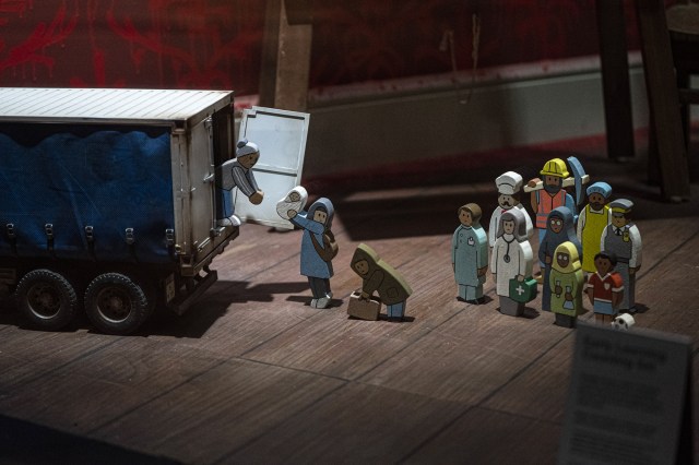The temporary installation, which will be on view for two weeks in the Croydon neighborhood, incorporates multiple window displays for a shop that is not in fact open to passersby. However, some of the items on display are available for purchase in GDP’s associated online store including the welcome mats, which Banksy hired refugees in Greek detainment camps to stitch; all proceeds go back to the refugees. Revenue from sales of the doll sets will also support the purchase of a replacement boat for activist Pia Klemp, whose boat was confiscated by the Italian government.[…]