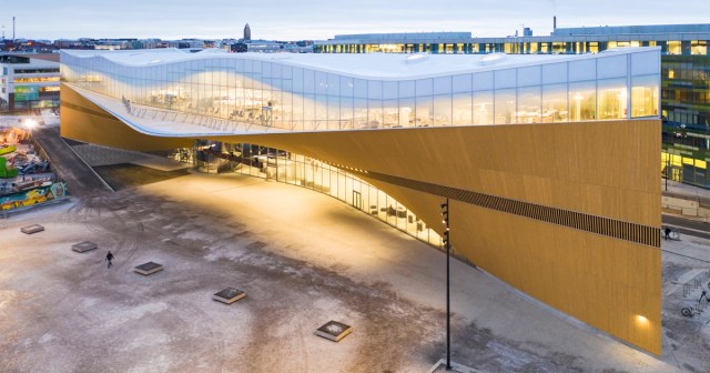 Readers, researchers, and other curious residents are encouraged to gather together in a massive new ship-shaped library in Helsinki, Finland. Designed by ALA Architects, Oodi Central Library, the long and narrow structure features a sweeping wooden exterior topped with two stories of glass walls. Oodi Central Library is situated in the heart of Helsinki, nestled in the capital city’s cultural district. About one-third of the space is dedicated to books. A cafe, restaurant, public balcony, movie theater, recording studios, and a maker-space broaden the institution’s ability to connect with, and serve the needs of, a diverse population.