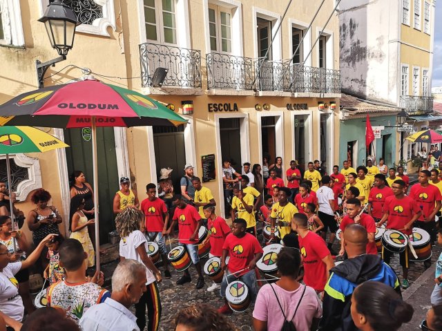 However, forty years ago most Afro-Brazilians living in Pelourinho – the historic city center of Salvador – were not allowed to participate. To guarantee them access to the festival, a group of musicians and artists founded Olodum: a bloco that aimed to highlight African heritage during the massive yearly parades, and uplift the Afro-Brazilian community of Pelourinho through music, art and dance.