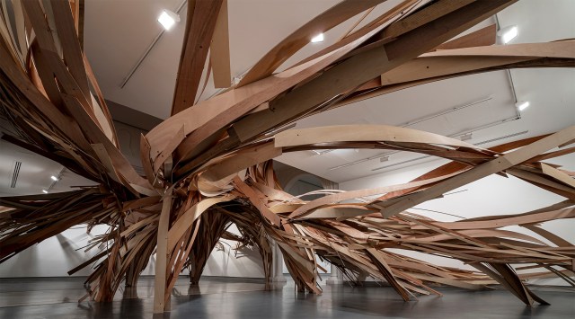 More: Giant Ribbons of Wood Form Twisting Root Structures in Expansive Installation