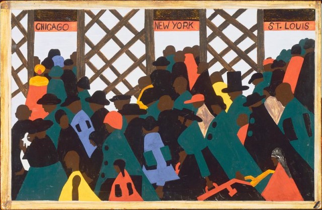 Jacob Lawrence, Panel 40 (“Great Numbers”) from the “Migration Series,” 1940-1941 (Photo: Ron Cogswell via Flickr Public Domain)Completed in 1941, The Migration Series colorfully tells the story of the Great Migration—a mass exodus of over 6 million African Americans from the South. Fleeing economic hardship and laws shaped by segregation, these individuals relocated to urban areas in the West, Midwest, and—most prominently—the North. In these new cities, the migrants mostly stuck together, forming supportive communities by settling into neighborhoods like Harlem.