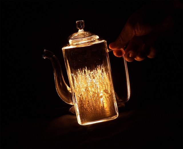 Japan-based artist Ayumi Shibata (previously) constructs intricate paper cities and natural landscapes that both fit in the palm of her hand and are expansive enough to pass through on foot. Using dozens of layers of paper for a single project, Shibata carves miniature houses, clouds, and tree-filled forests that eventually are illuminated in glass vessels, stored safely in a book, or erected in large-scale installations.